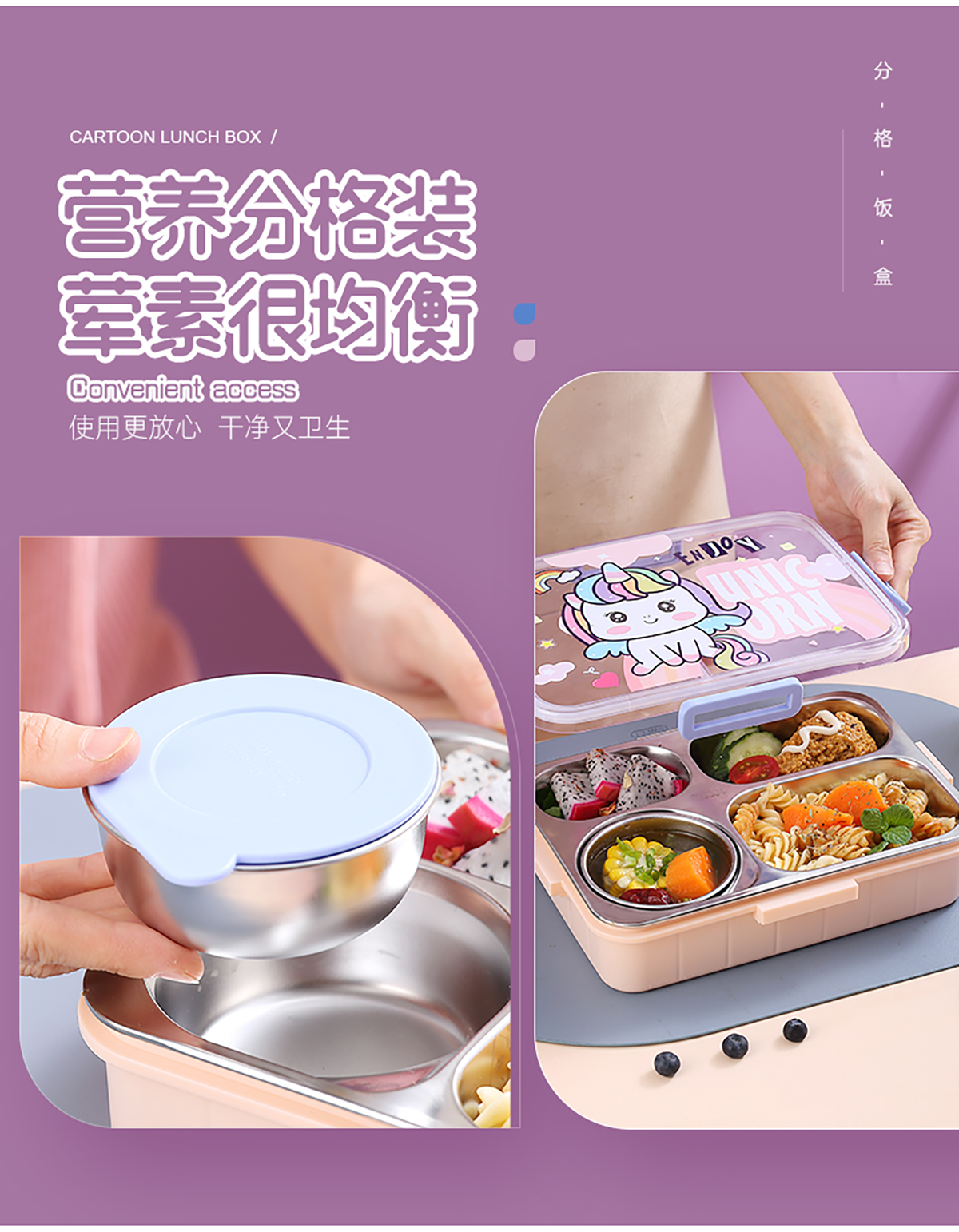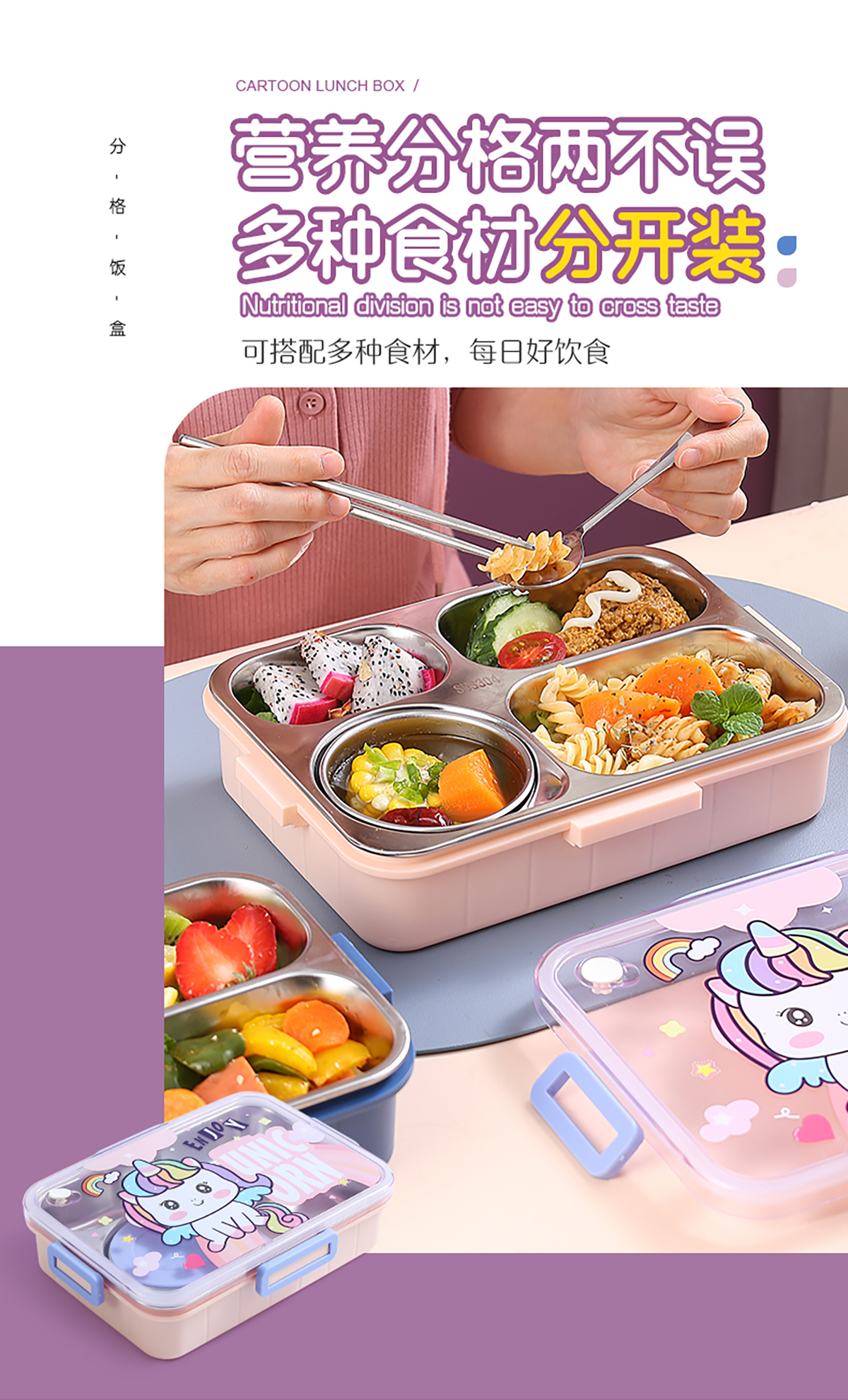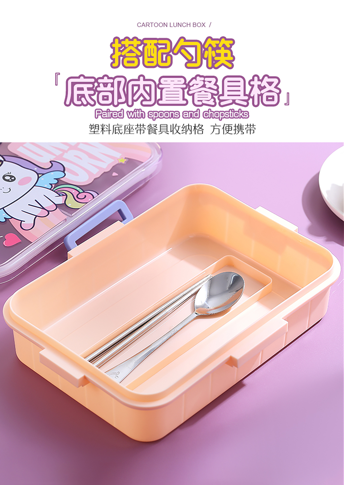 900ml獨(dú)立密封不銹鋼餐盒(卡通四格+不銹鋼勺筷/碗150ml不銹鋼勺筷)