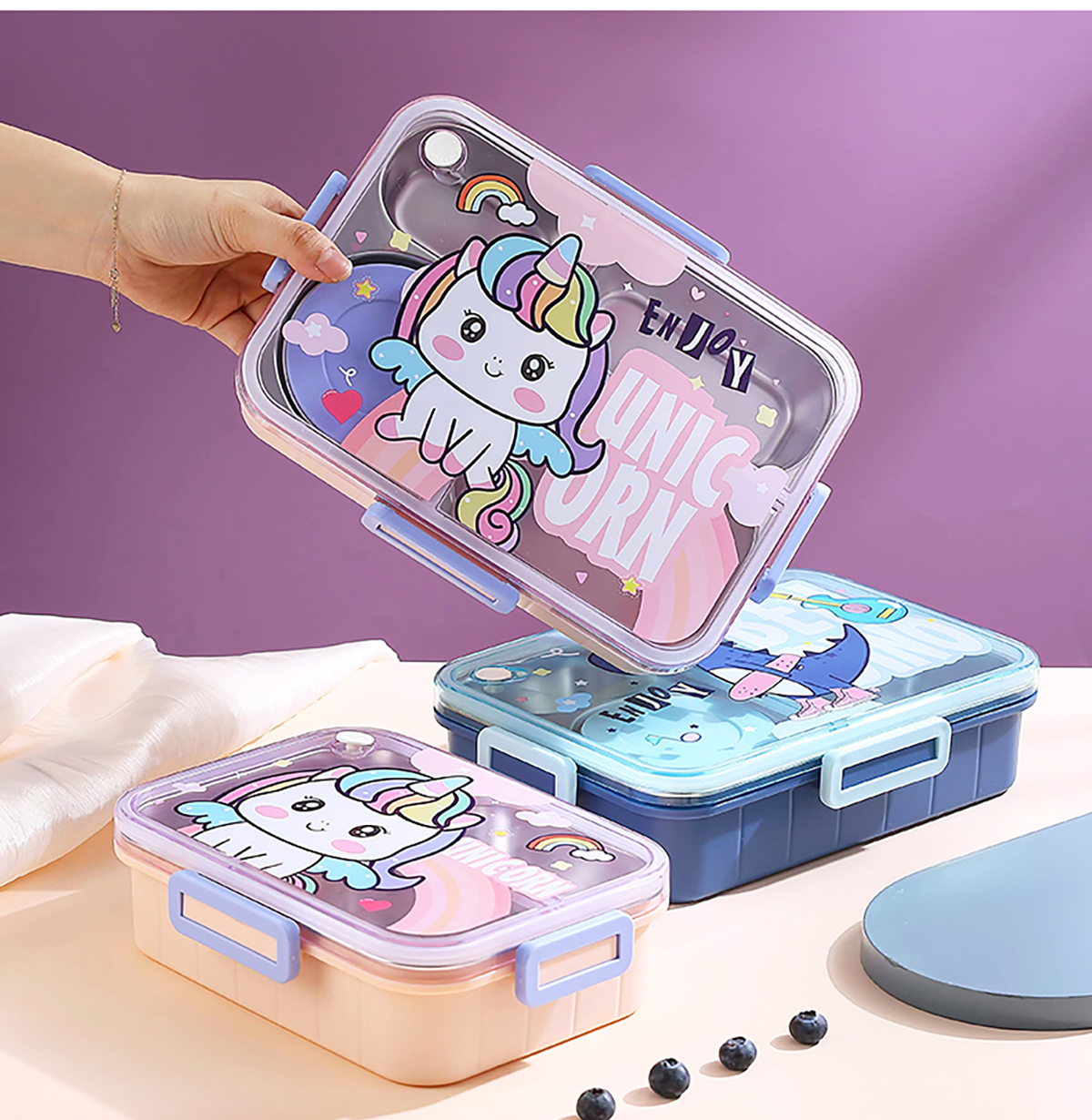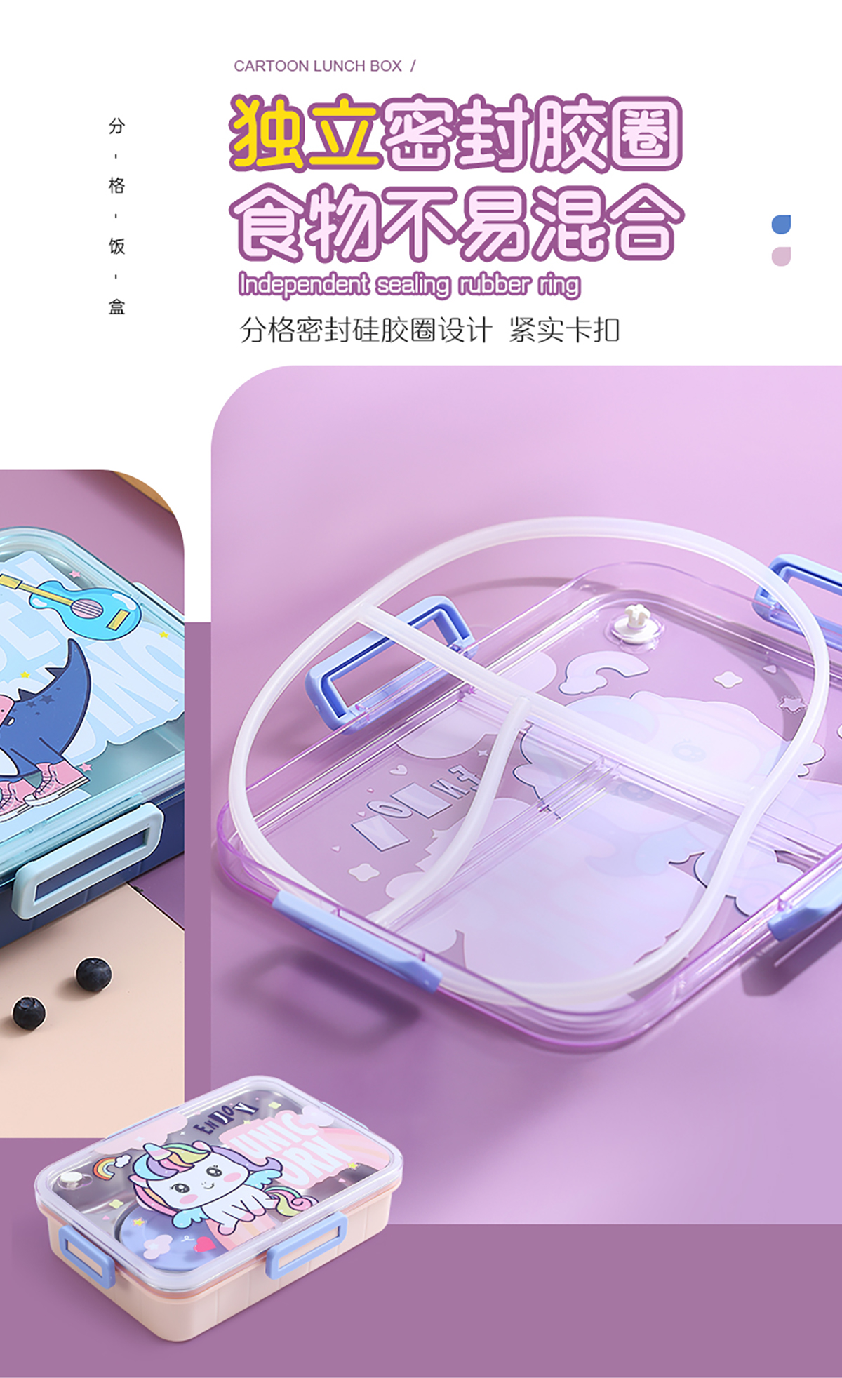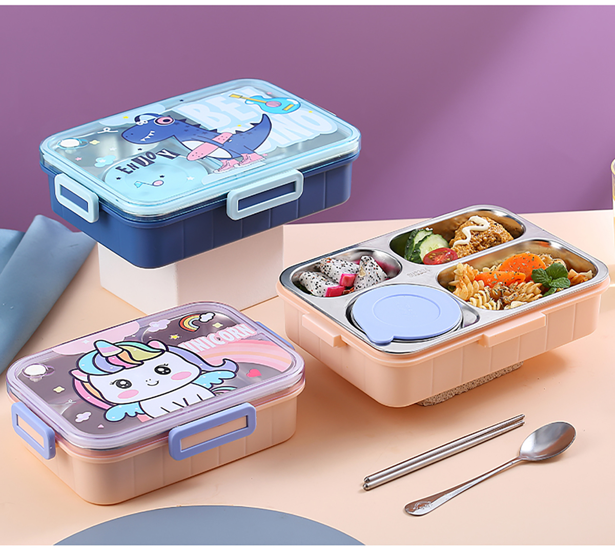 900ml獨(dú)立密封不銹鋼餐盒(卡通四格+不銹鋼勺筷/碗150ml不銹鋼勺筷)