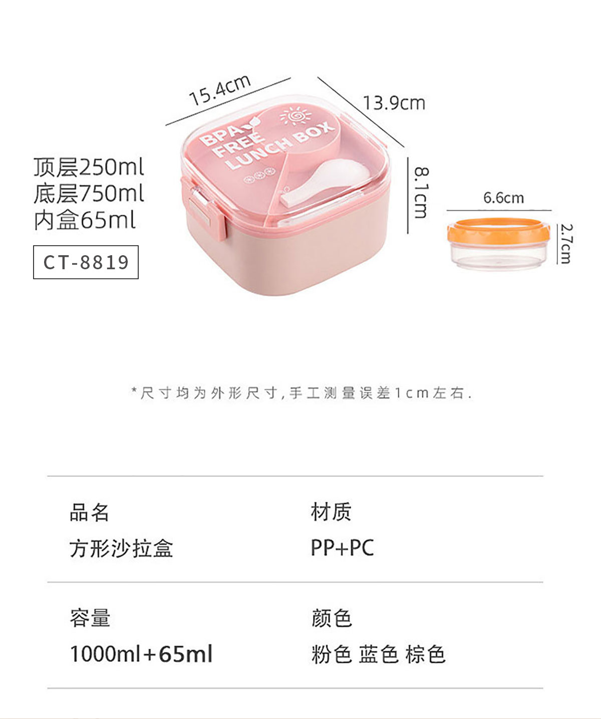 Size: CT-8818(不帶沙拉盒):154*139*81mm/1000ml CT-8819(帶沙拉盒):154*139*81mm/1000ml+65ml