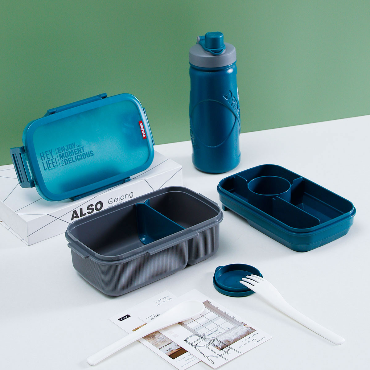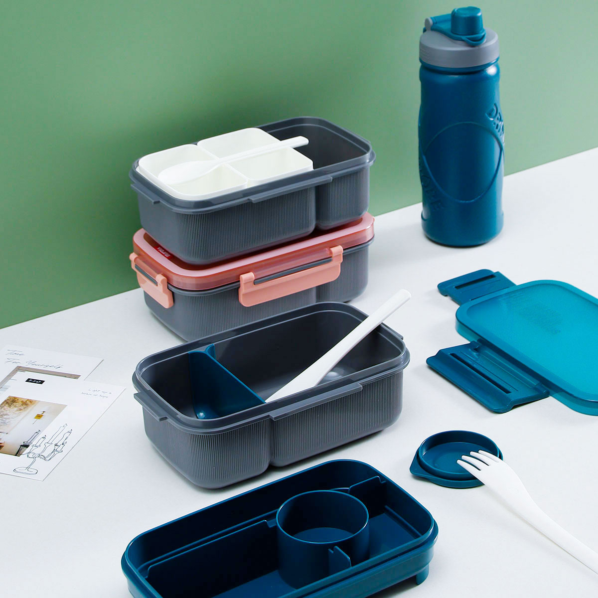 寰彩密封單層3格/雙層6格飯盒(長方高款)+運動水壺套裝/單個