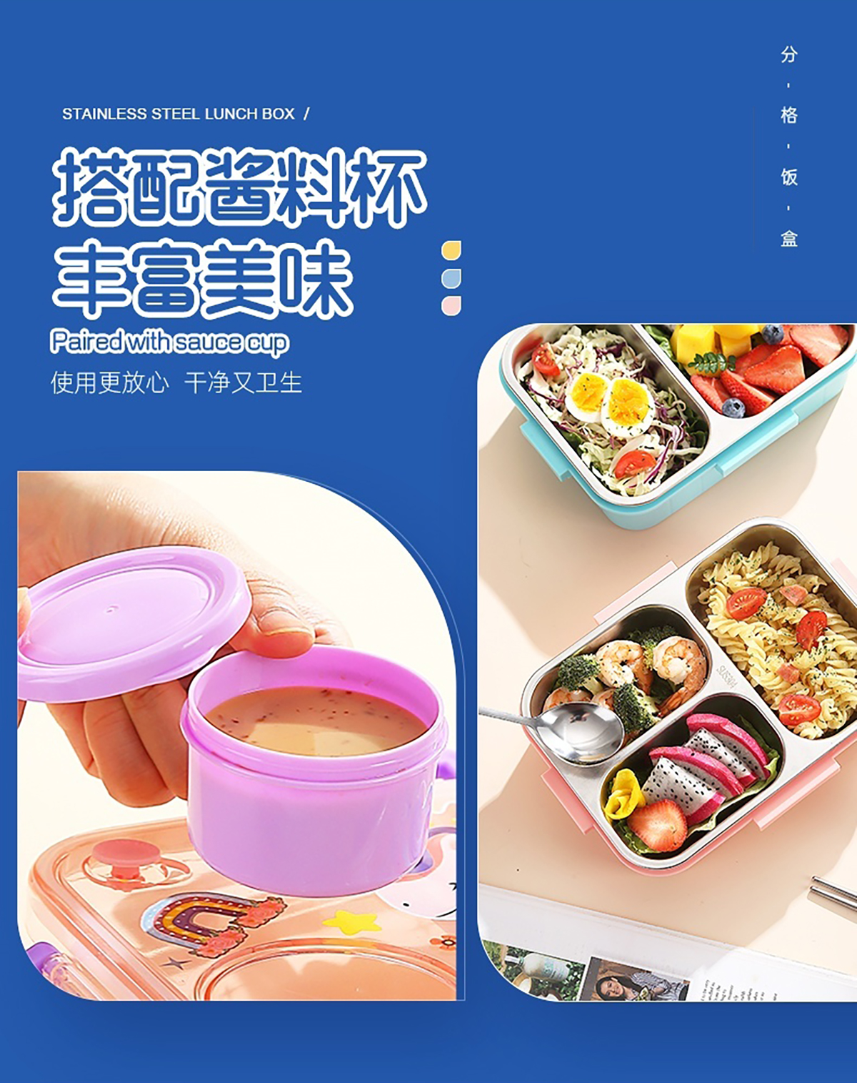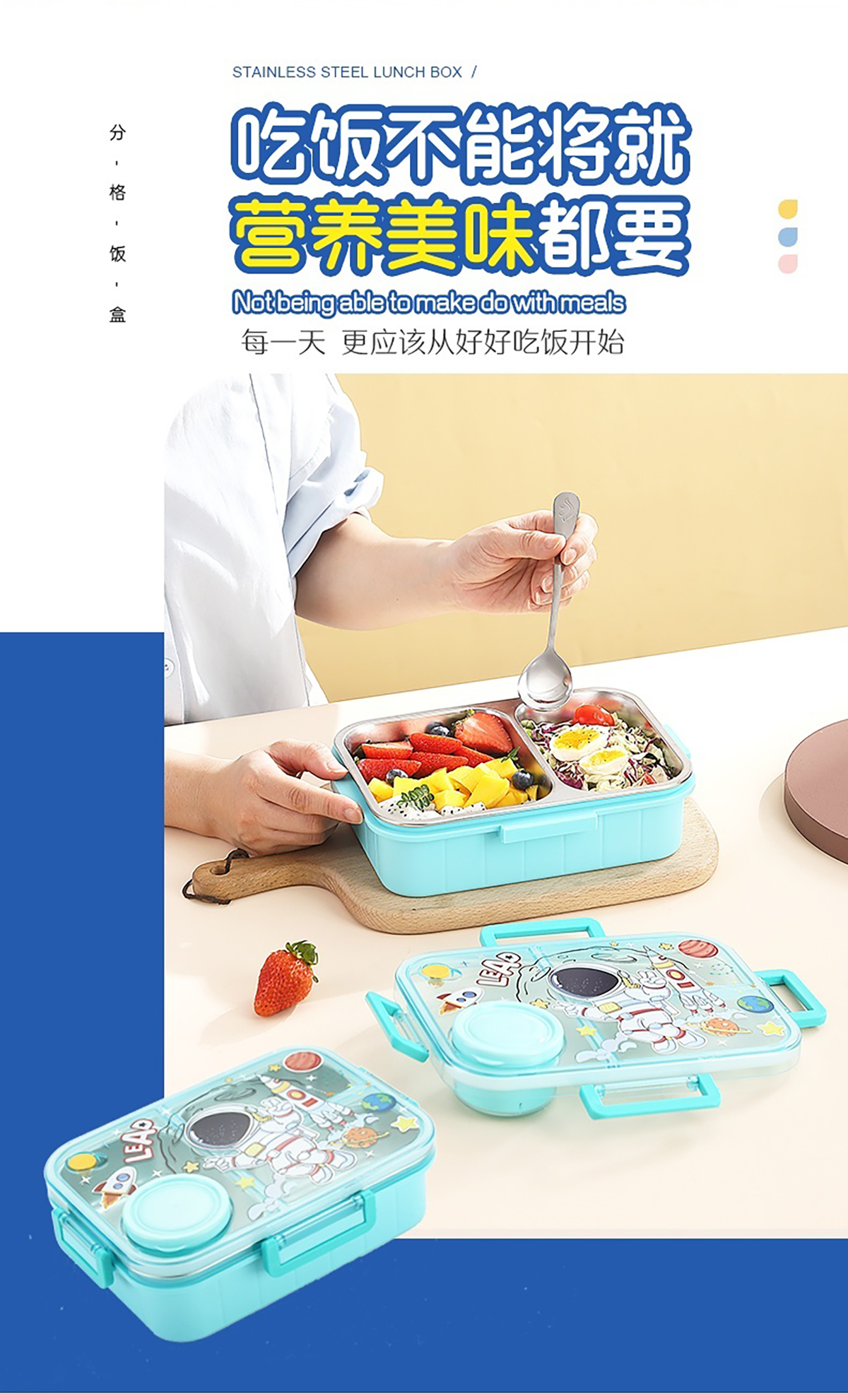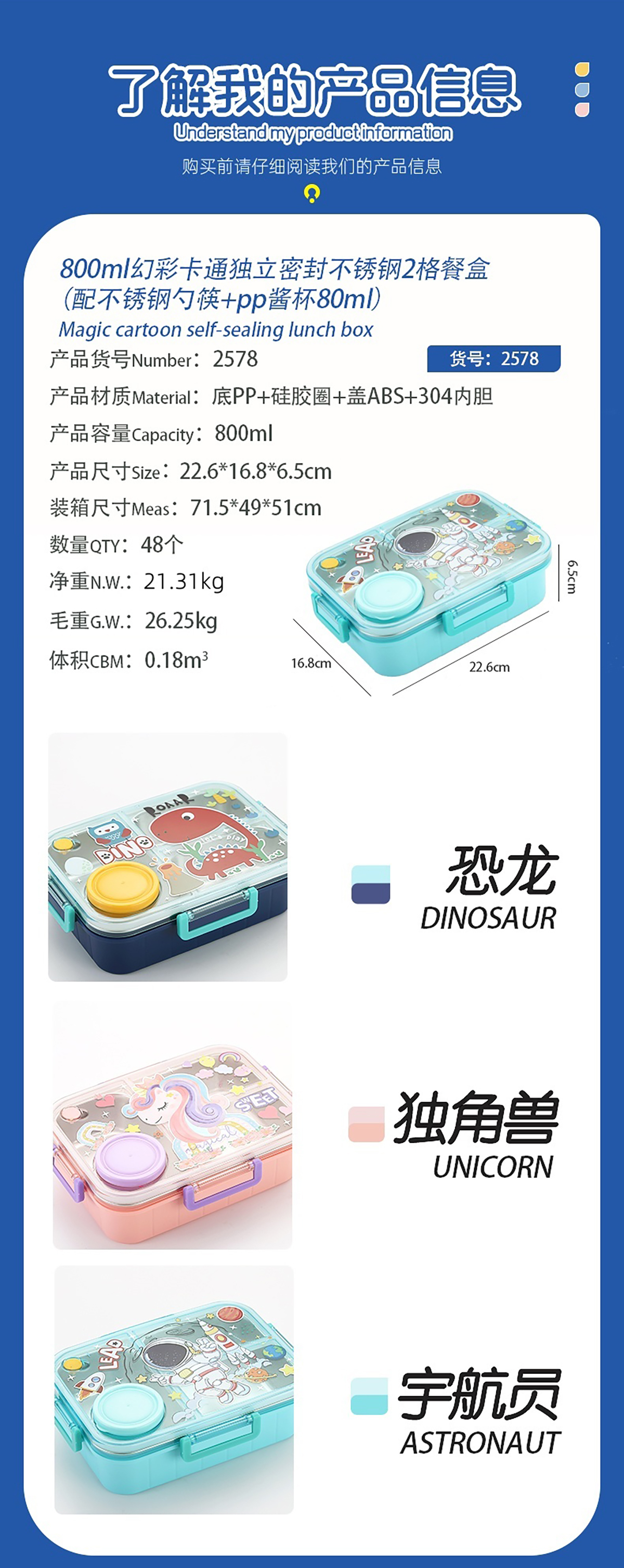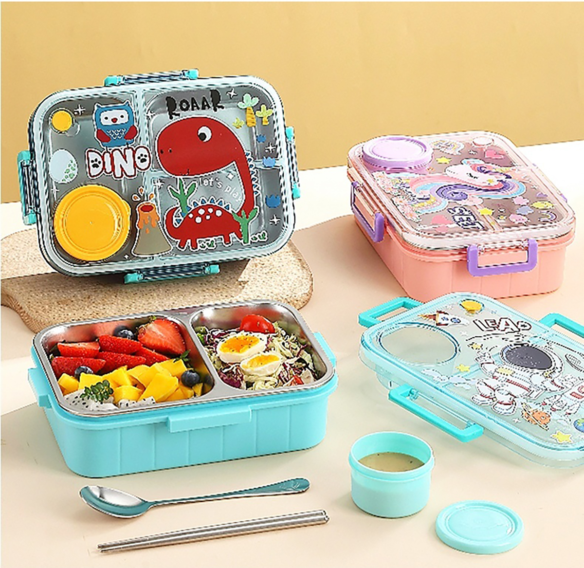 幻彩卡通獨(dú)立密封餐盒(2格800ml/3格750ml配不銹鋼勺筷+PP醬杯80ml)
