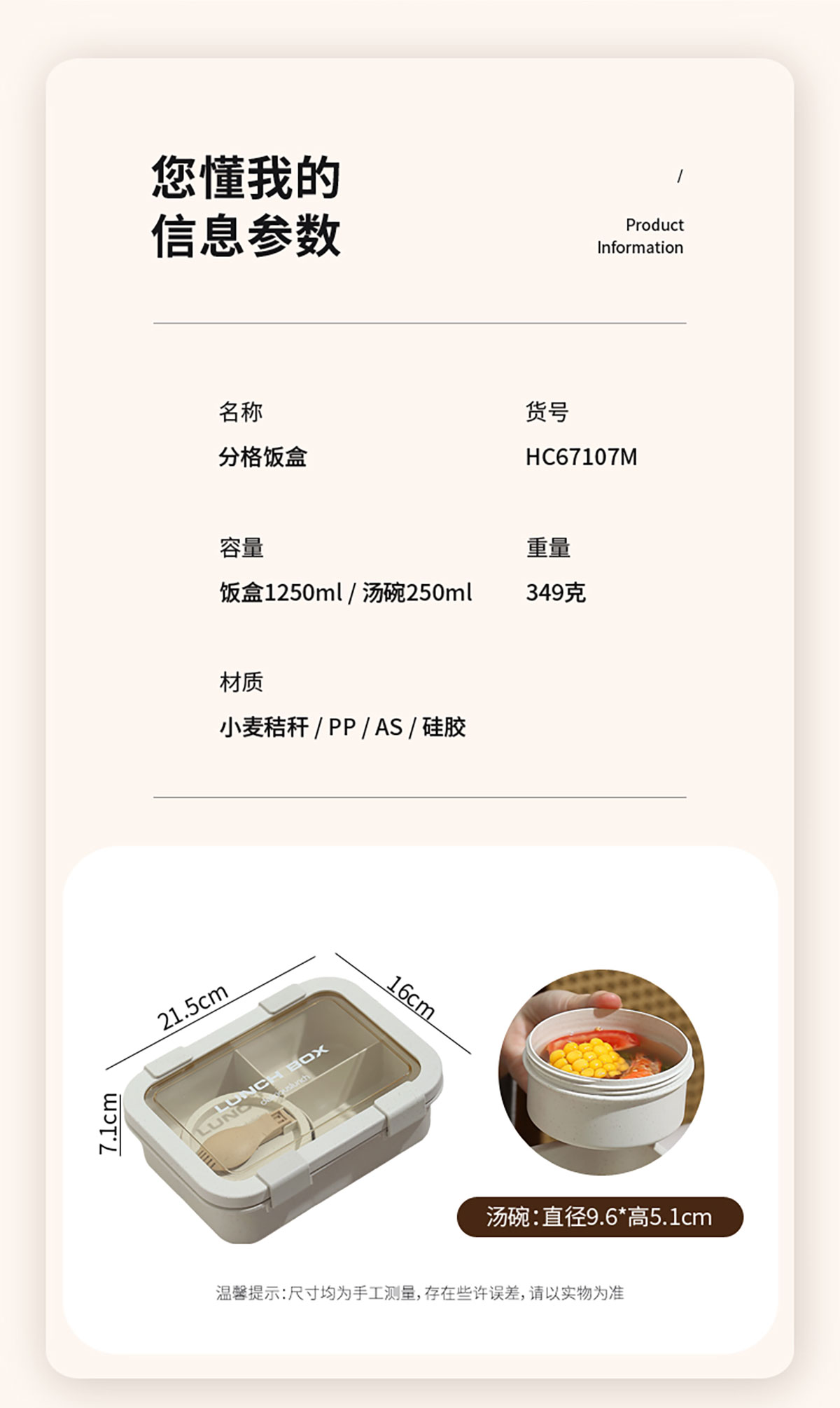 Size: 飯盒:215*160*71mm/1250ml 湯碗:直徑96*51mm/250ml