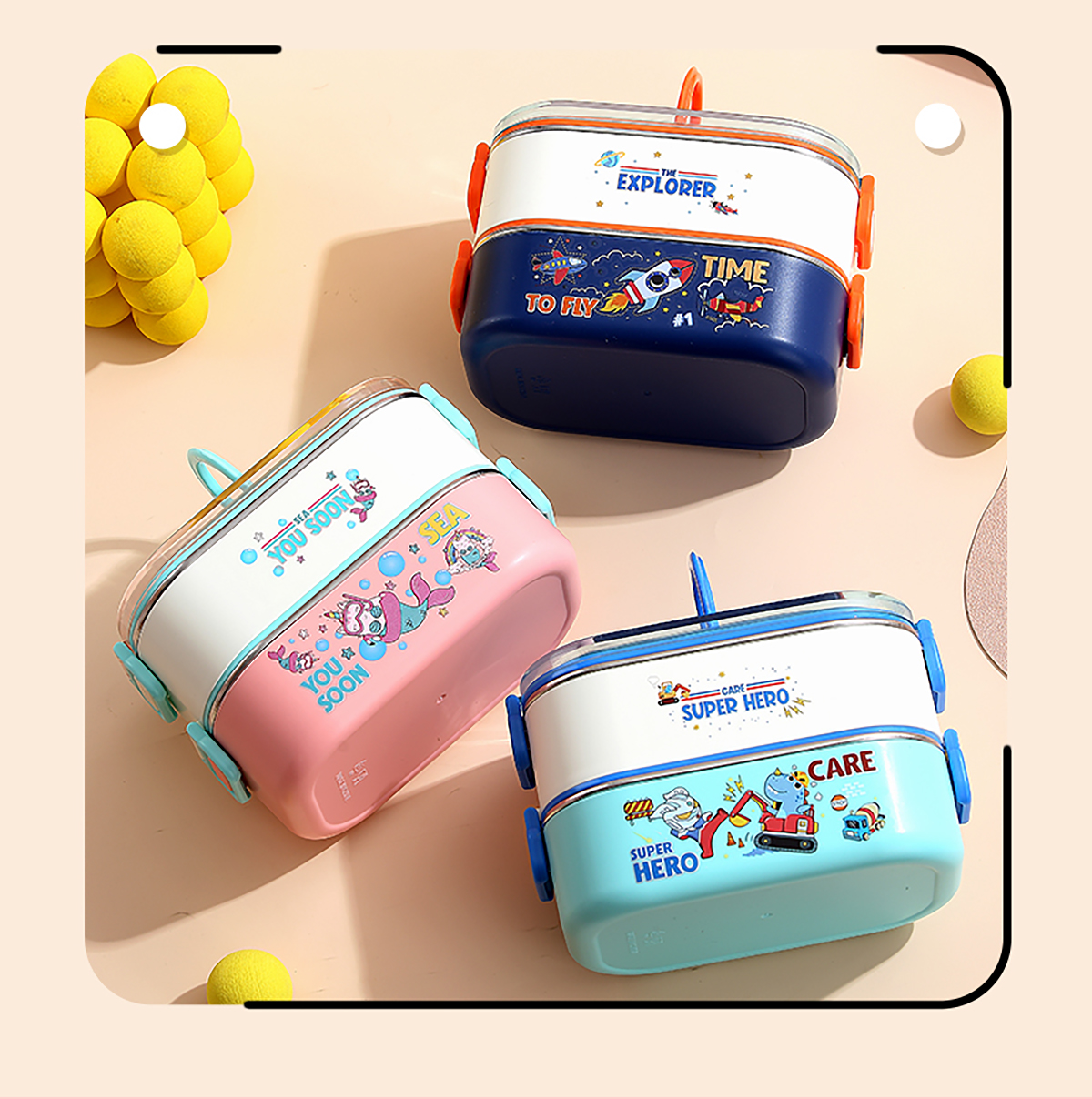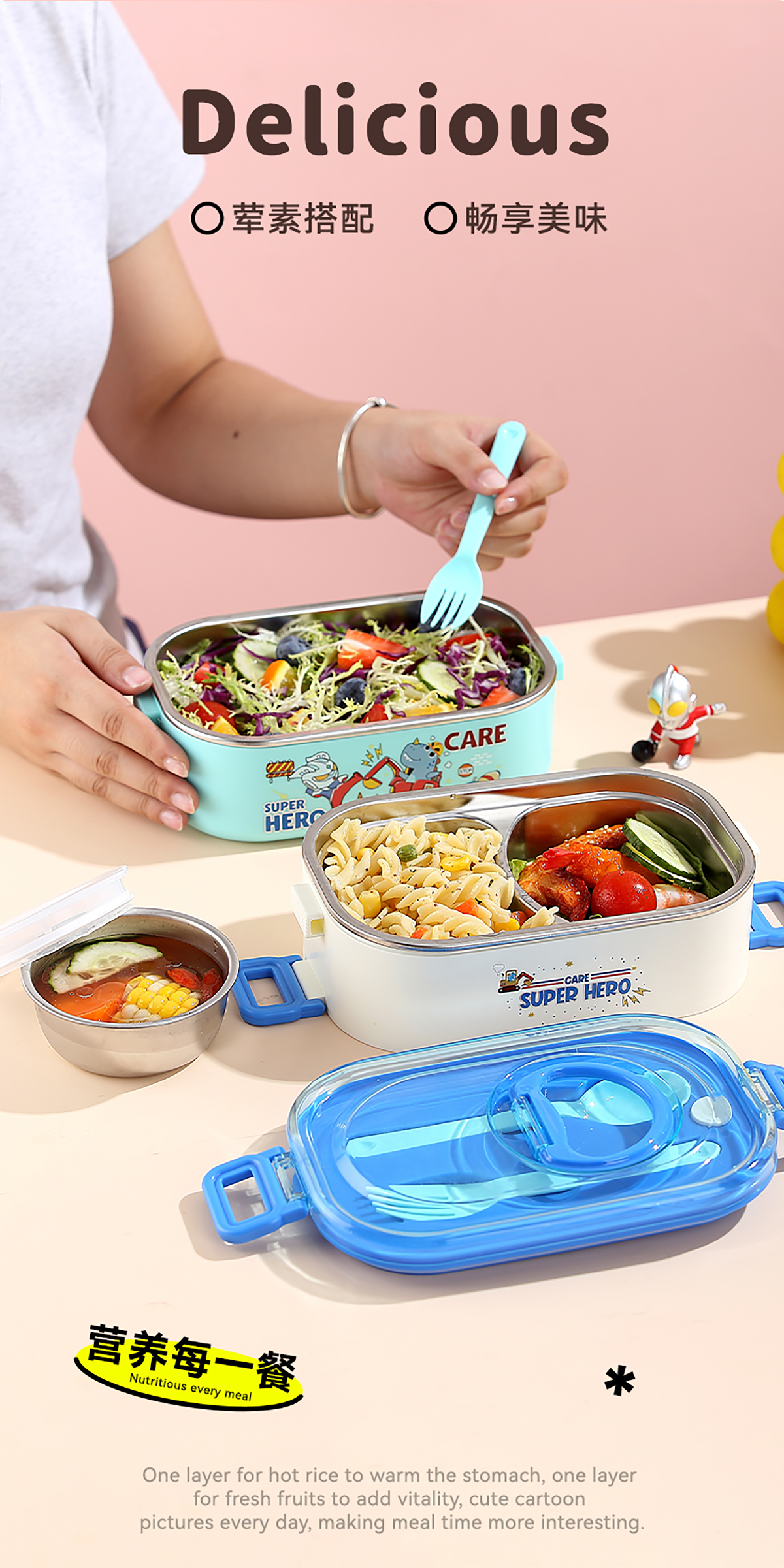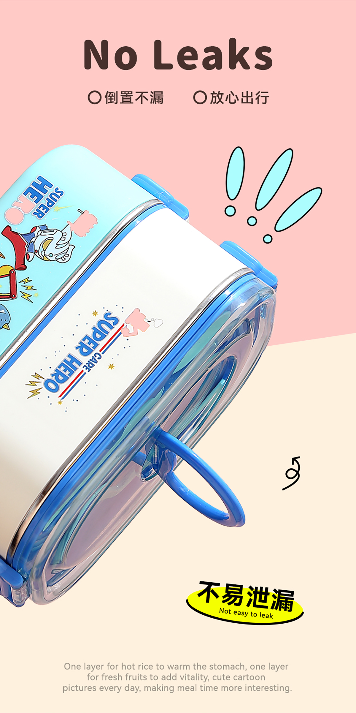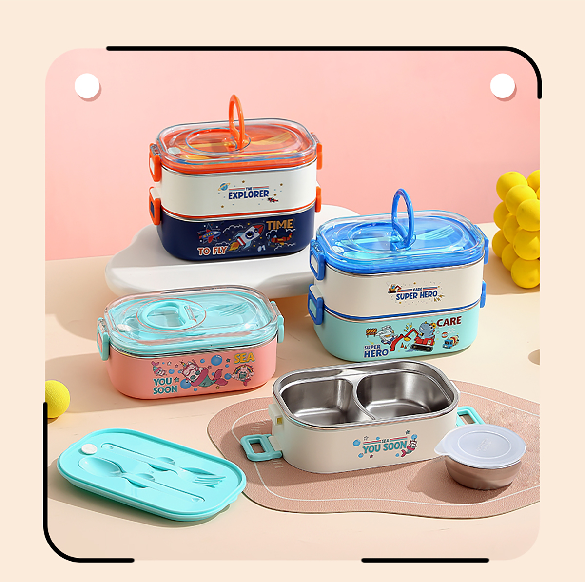 卡通手提雙層不銹鋼餐盒(單格900ml+2格850ml+不銹鋼碗150ml+PP叉勺)